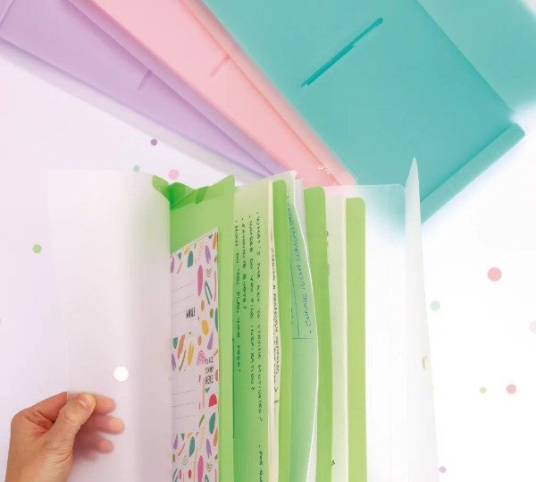 Clasificador a4 (20x30 cm) de pvc colores pasteles con 5 bolsillos para organizar papeles.