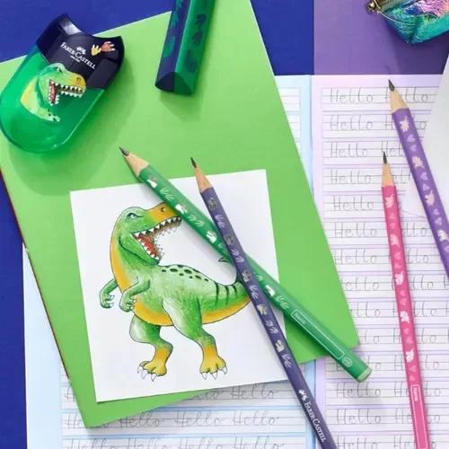 Este blíster de 4 EcoLápices de grafito con diseños de dinosaurio/Unicornio es ideal para manos pequeñas, gracias a su cuerpo triangular ergonómico que facilita el agarre.