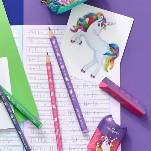 Este blíster de 4 EcoLápices de grafito con diseños de dinosaurio/Unicornio es ideal para manos pequeñas, gracias a su cuerpo triangular ergonómico que facilita el agarre.